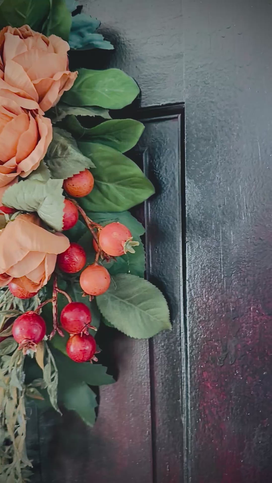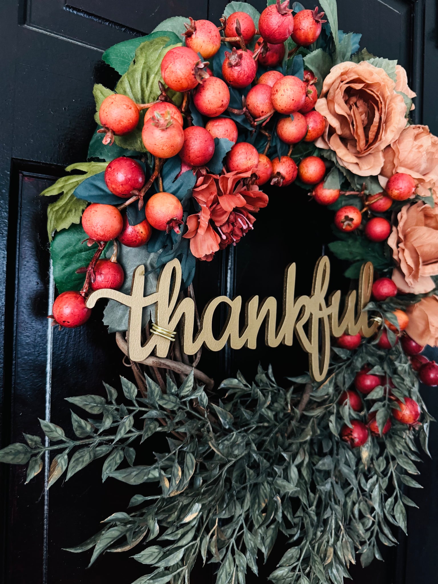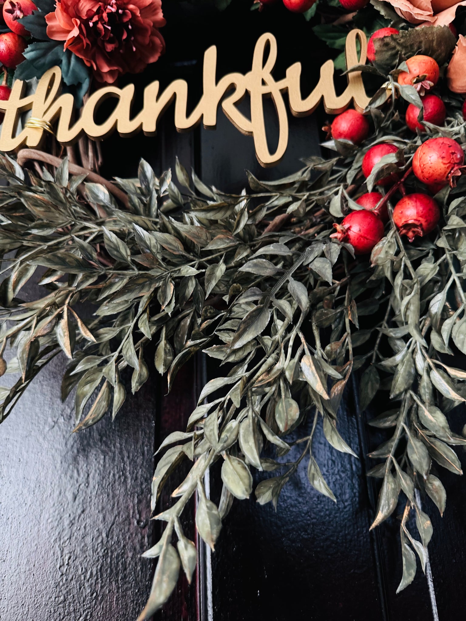 Roses, berries, and ruscus leaves. Accented with a gold-painted wood “thankful”. Created on a 14-inch grapevine base.