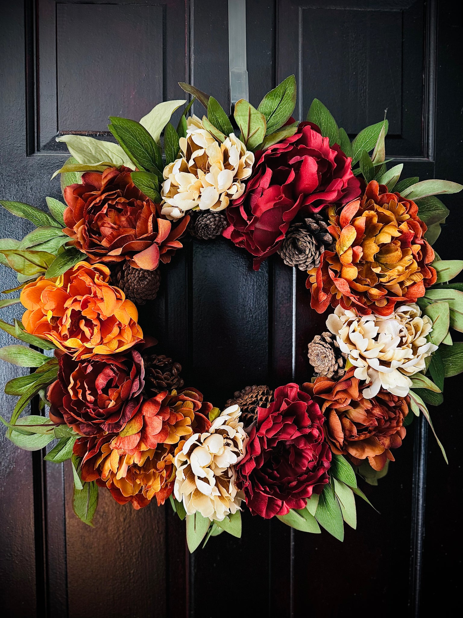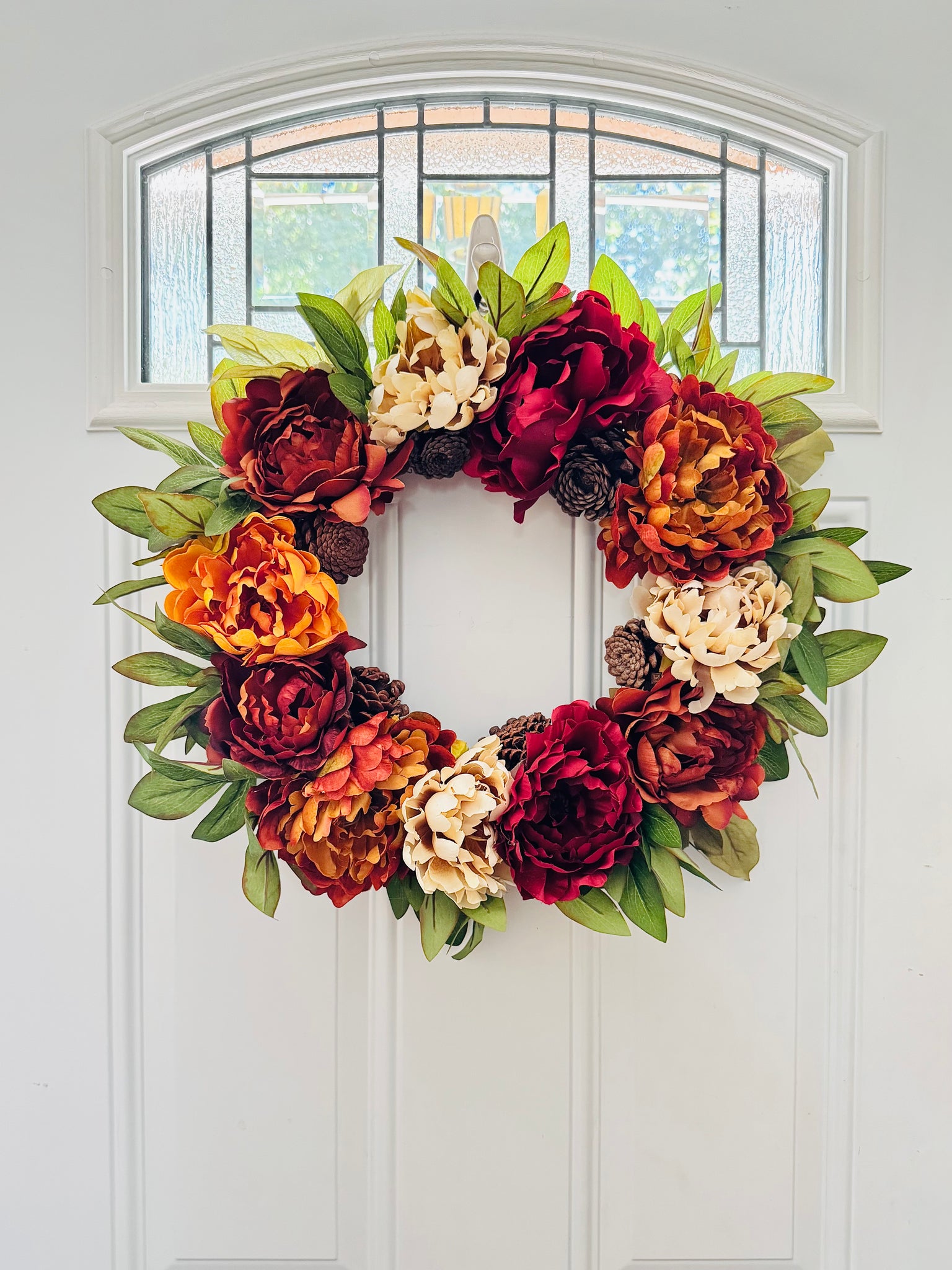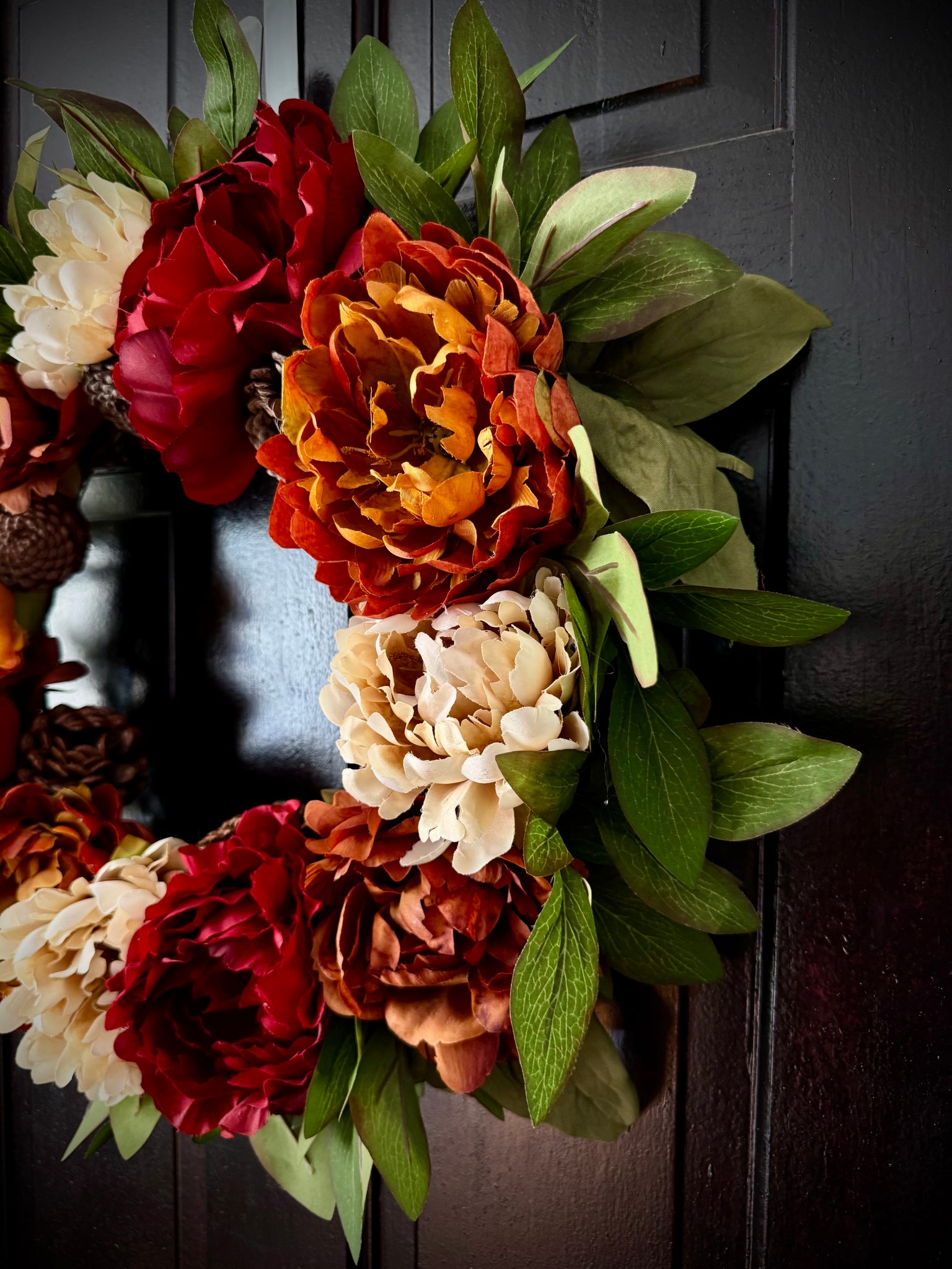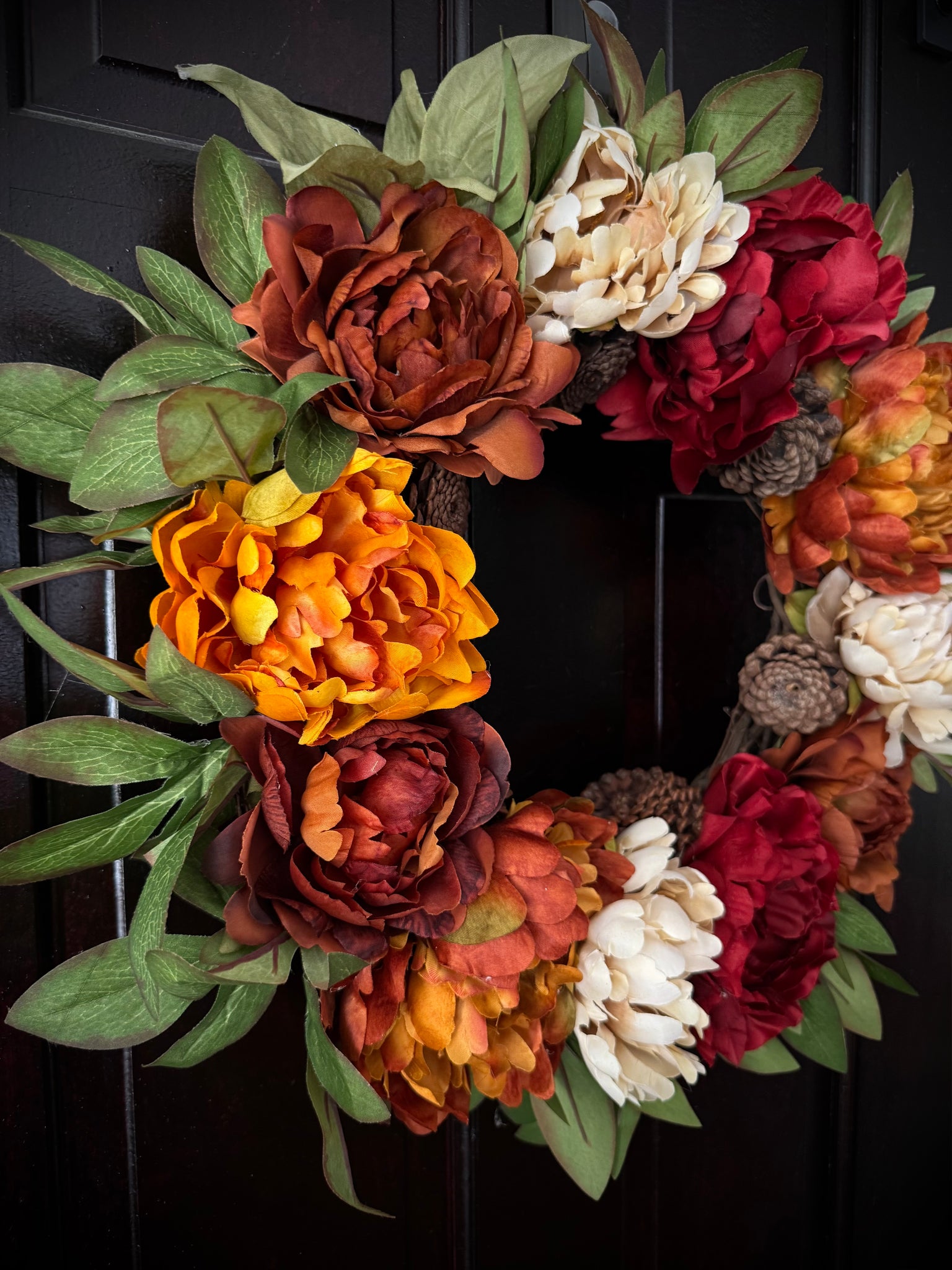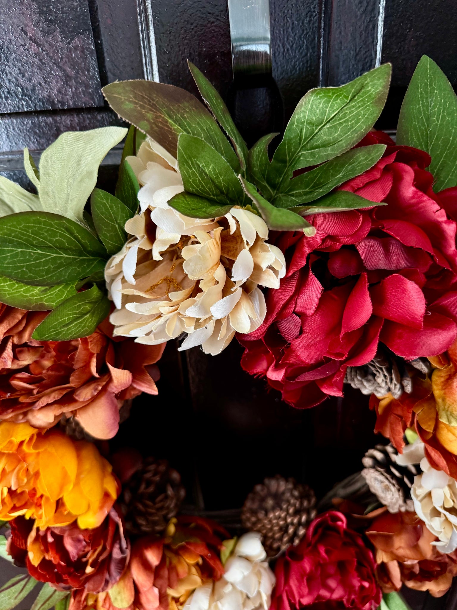 Bold peonies and pinecones, nested on a 14 inch grapevine base.